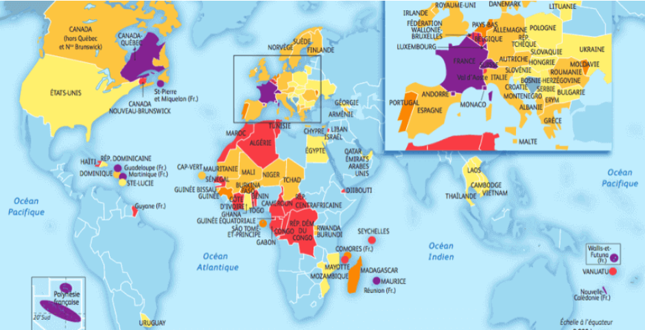 Congo DR, Madagascar, Cameroon, Ivory Coast, Niger, Burkina Faso, Mali, Senegal, Chad, Guinea, Rwanda, Benin, Burundi, Togo, Congo, Central African Republic, Gabon, Equatorial Guinea, Djibouti, Comoros and Seychelles.